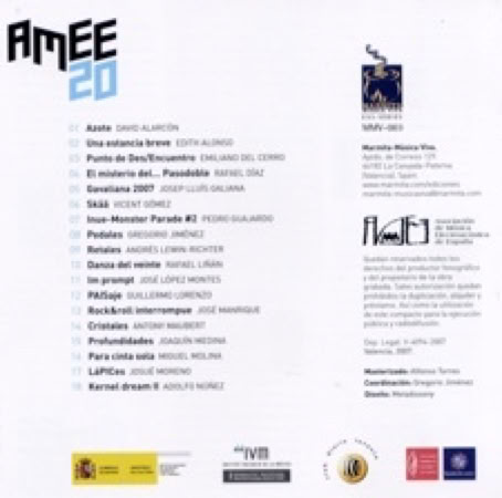 AMEE 20. (2007). This album, which commemorates the twentieth anniversary of the Association of Electroacoustic music of Spain, (AMEE) comprises works by various composers and includes the track “Profundidades” composed by myself for this event.